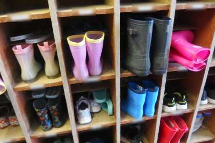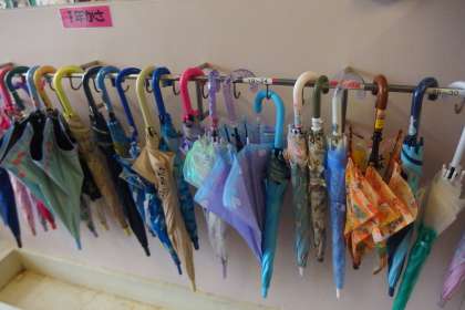 下駄箱にはカラフルな長靴と傘が並びました。