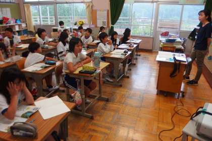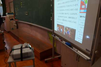 4年生の理科の授業です。 デジタル教科書をスクリーンに映しています。