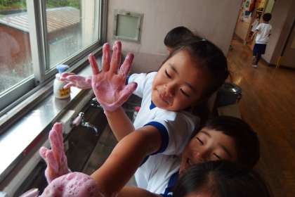 写真ではわかりづらいですが、絵の具のせいで手がピンク色でした。 AIUU