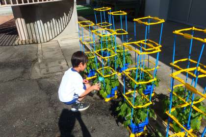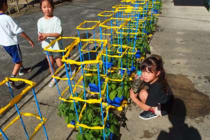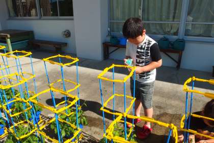 登校してすぐにアサガオに水やりをしている1年生です。 SAIBAI