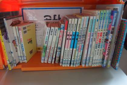 6年生の教室の前には修学旅行の参考図書が置いてありました。