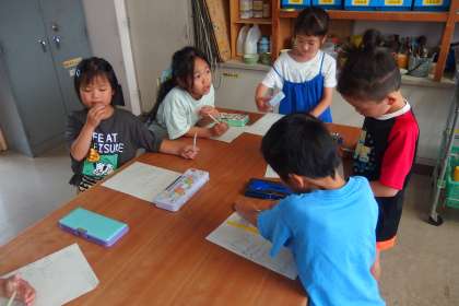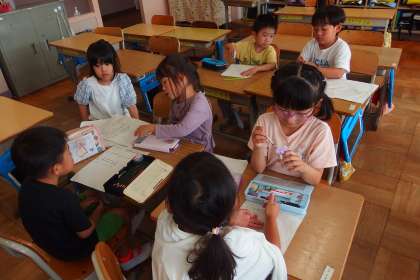 萩野小との交流行事の準備をしている1年生です。