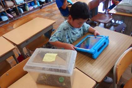 生き物の観察日記をタブレットに記入している2年生です。