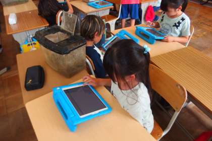 生き物の観察日記をタブレットに記入している2年生です。