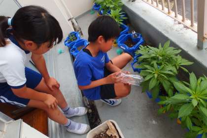ホウセンカに水やりをする3年生です。 SAIBAI