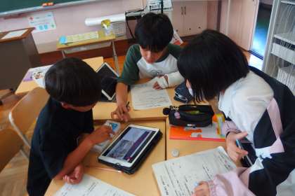 パワーポイントで作成したまとめをタブレットで示しながら発表しているところです。
