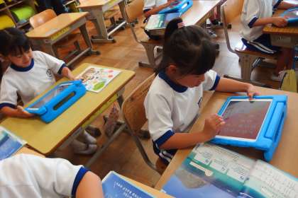 タブレットで教科書のQRコードを読み取って学習を進めていました。