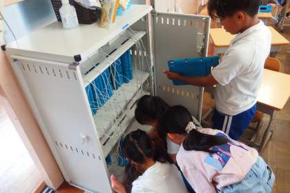 夏休みにたくさん使ったタブレットを保管庫に戻している3年生です。