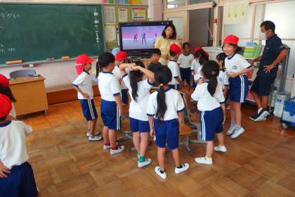 1年生の体育の授業です。 猛暑を避けて、教室内でからだを動かしました。 TAIIKU