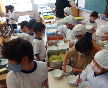 給食の配膳の様子です。