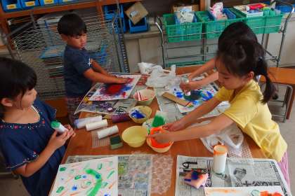 スポンジや巻き芯などを道具として絵の具で描画をしていました。