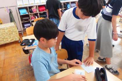 5年生の英語の授業です。 友だちとの英会話を通して会話力を伸ばしていきます。 英語を高め合い、学び合い。