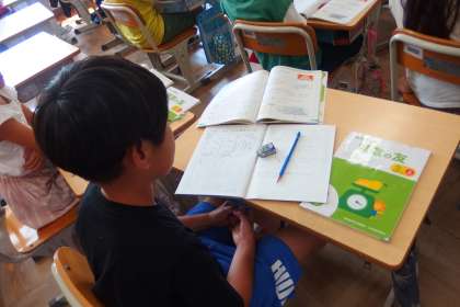 3年生の算数の授業です。 スクリーンに映し出されたデジタル教科書の問題を解いていました。
