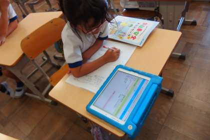 タブレットから連絡を写す3年生です。