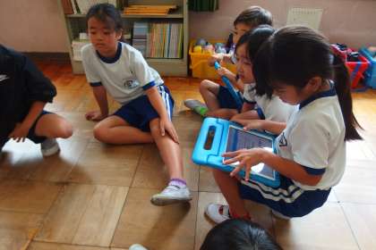 1年生と2年生の合同授業です。 タブレットを使ってクイズを出題しています。