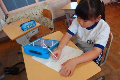 タブレットから連絡を写す3年生です。
