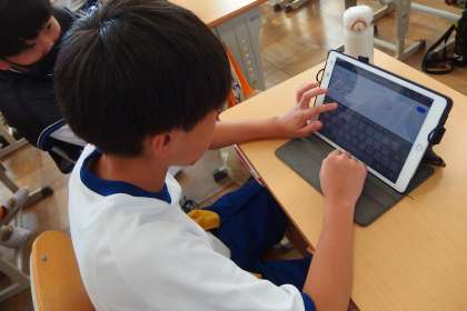 タブレットを使って調べ物をして、修学旅行の準備、計画を進めている6年生です。