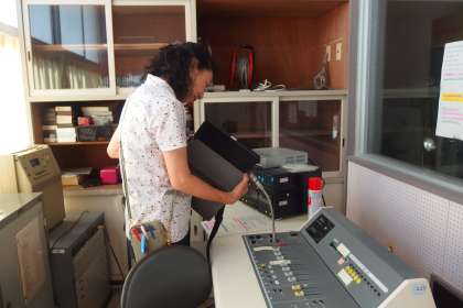 デジタルなタブレットから音を流し、アナログなマイクで音を拾って放送しています。