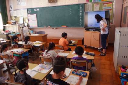 1年生の国語の授業です。 電子黒板にデジタル教科書を映し出して解説をしていました。