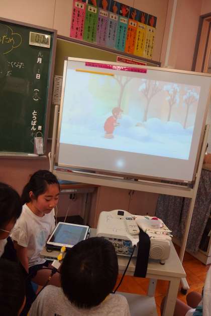 休み時間にタブレットの読み聞かせ絵本を楽しんでいる3年生です。