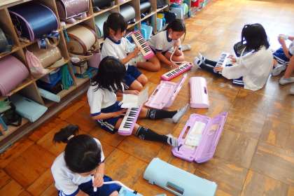 休み時間に鍵盤ハーモニカを練習している2年生です。 お互いが弾き合い、聴き合い、小さな学び合い。