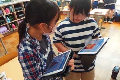 9月20日の東広瀬小学校 公開日 2024/09/21 更新日 2024/09/21 活動の様子 5年生の英語の授業です。 「who is this?」の文を使って友だち同士でクイズを出題し合っています。 タブレットを提示して見せています。