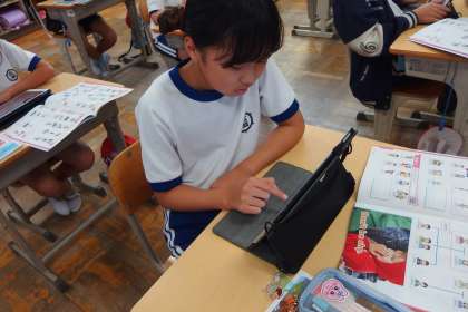 5年生の外国語活動の授業です。 英語の発表原稿をタブレットにまとめています。
