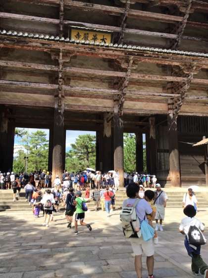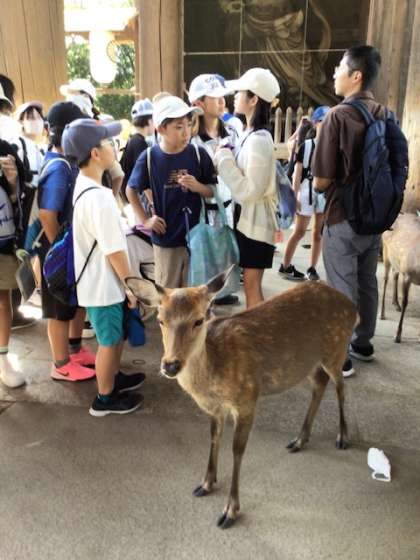 6年生の修学旅行は1日目です。 奈良に滞在中です。 奈良公園でシカと触れ合い、金剛力士像を見ました。