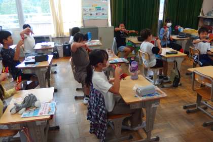 運動会の表現タイムで使うグッズが届きました。 さっそく使ってみる5年生です。