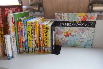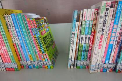 学習用に学校図書館司書さんが教室の前にそろえてくれた防災関連の書籍です。