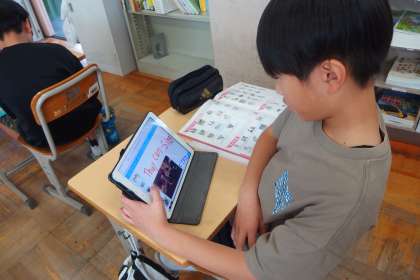 5年生の外国語活動の授業です。 英語の発表原稿をタブレットにまとめています。