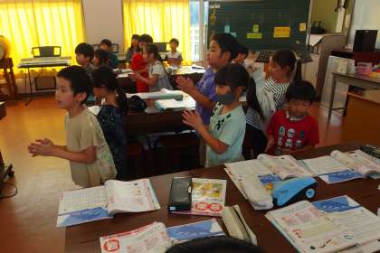 指導者用デジタル教科書から出ているメロディーに合わせてリズムをとり、大きな声で歌っていました。