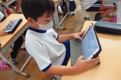 タブレットを使って修学旅行のまとめをしている6年生です。