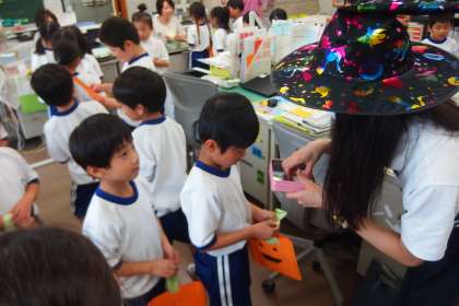 先生たちはお菓子ならぬステッカーをプレゼントしていました。