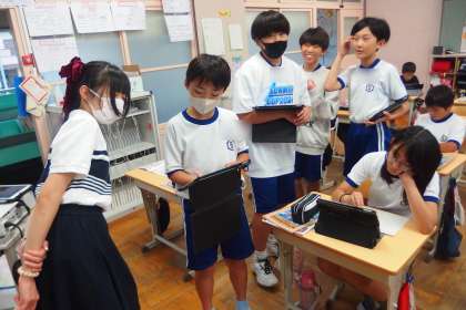 6年生の英語の授業です。 ALTの先生と英会話に挑戦です。 タブレットをプレゼンに使っています。