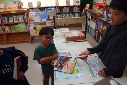 図書委員がパソコンを操作して貸し出し手続きをしてくれています。