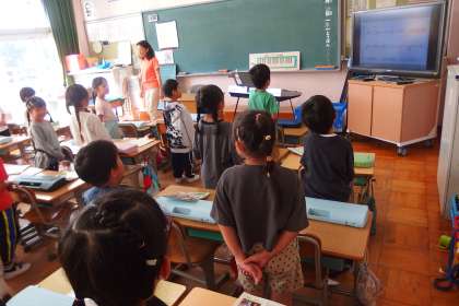 1年生の音楽の授業です。 デジタル教科書の音源に合わせて元気に歌っていました。