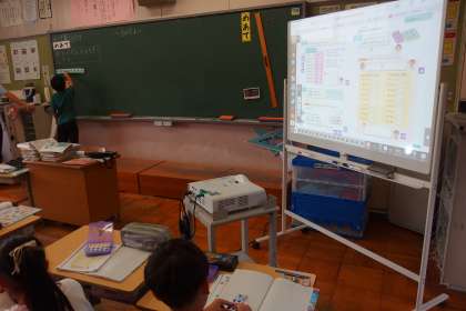 2年生の算数の授業です。 スクリーンに提示されているのはデジタル教科書です。