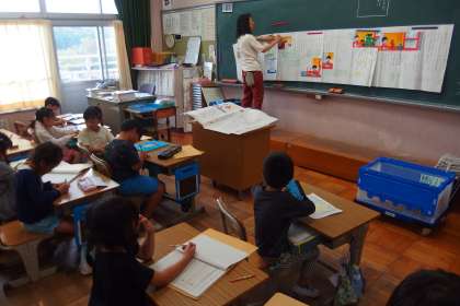 この授業では、デジタル教科書をスクリーンに映すのではなく、題材を大判プリンターで拡大して使っていました。