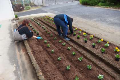 公務手さんたちが花壇の植え替え作業をしてくれています。