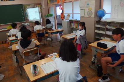 スクリーンに映るデジタル教科書の問題の解き方を話し合っていました。