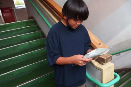 給食献立一口メモを紹介してくれる保健給食委員が原稿を読む練習をしているところです。