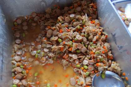 ピラフのような混ぜごはん類は給食センターで調理して配送することが難しいようで、いつもこのような状態で学校に到着します。