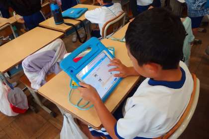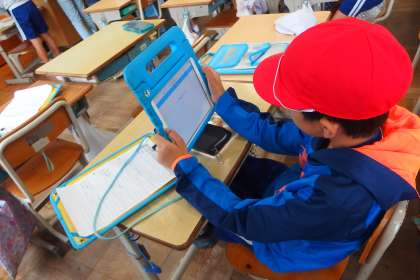 体育のマット運動で友だちにタブレットで撮影してもらった動画を視聴して振り返りを記入している2年生です。