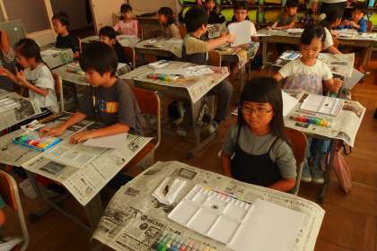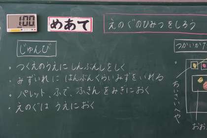 1年生の図工の授業です。 初めて絵の具を使います。