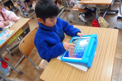 タブレットの新しいアプリの使い方を教えてもらっている1年生です。