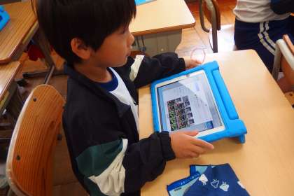 秋見つけをタブレットの発表ノートにまとめています。
