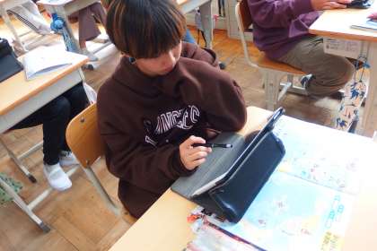 6年生の英語の授業です。 タブレットに振り返りを記入しています。
