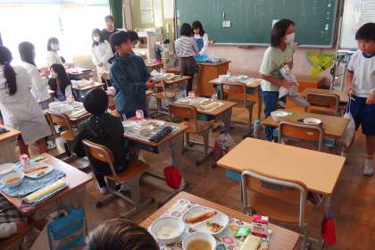 給食の配膳が終わり、いただきます直前の様子です。
