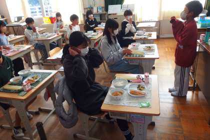 給食の配膳が終わり、いただきます直前の様子です。